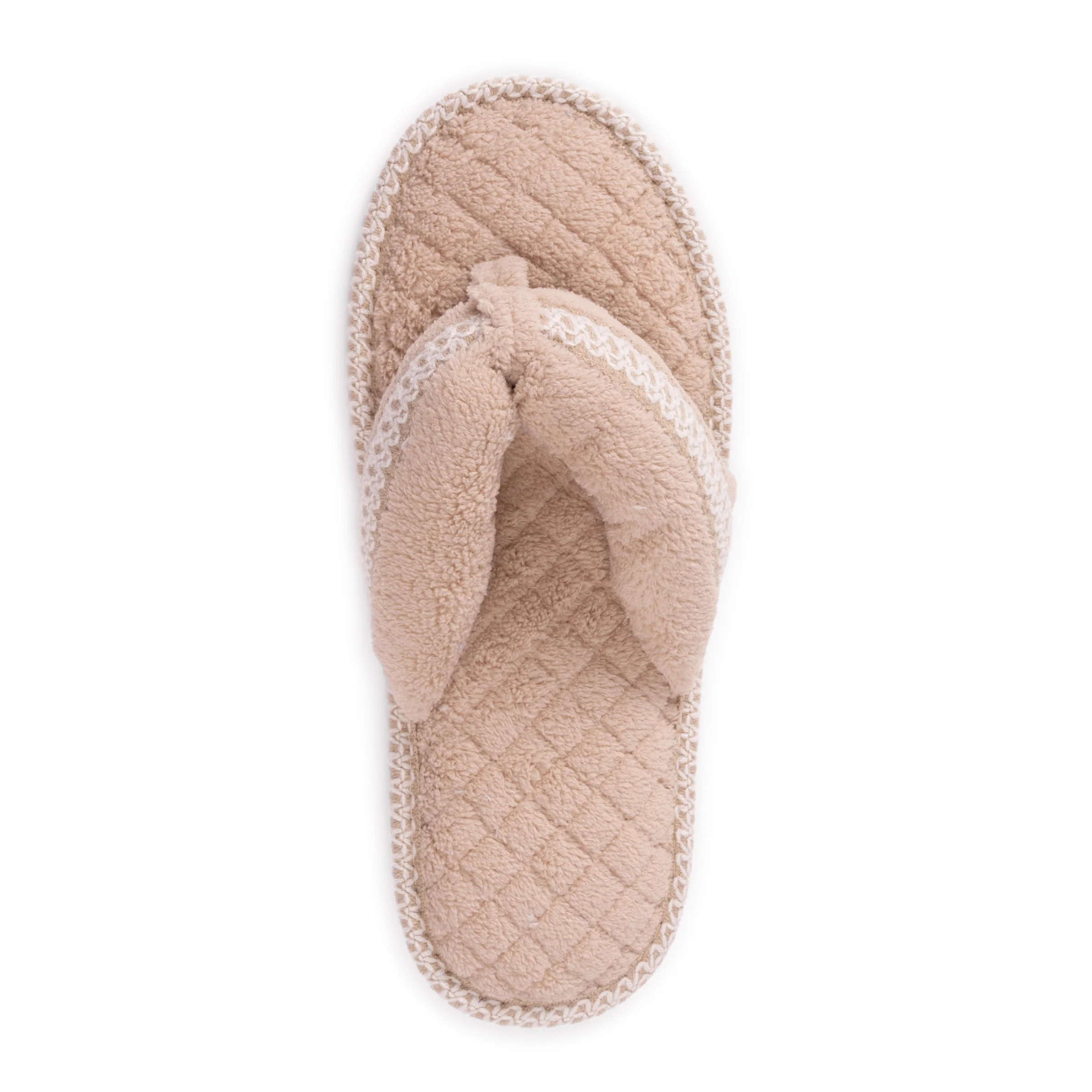 Pamper your feet by picking up a pair of our MUK LUKS® Darlene Micro Chenille Thong Slippers. The memory foam insole will give your feet the soft and added comfort they deserve. The design allows for added flexibility and still having the slip on convenience. Wipe with damp cloth. Do not bleach. Dry flat. Imported.